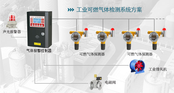气体探测器实时采集可燃气体信息,气体浓度达到报警值时,报警控制器联动声光报警器发出报警信号,报警控制器根据需求启动排风机、电磁阀等联动设备,并把报警信息上传至主机。
